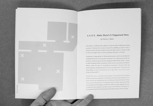 A booklet about his exhibition "It Happened Here" will be released. It includes examples of the work and "XAOS" a text written by Patrick J. Reed, framing the show in a critical and art historical context.
