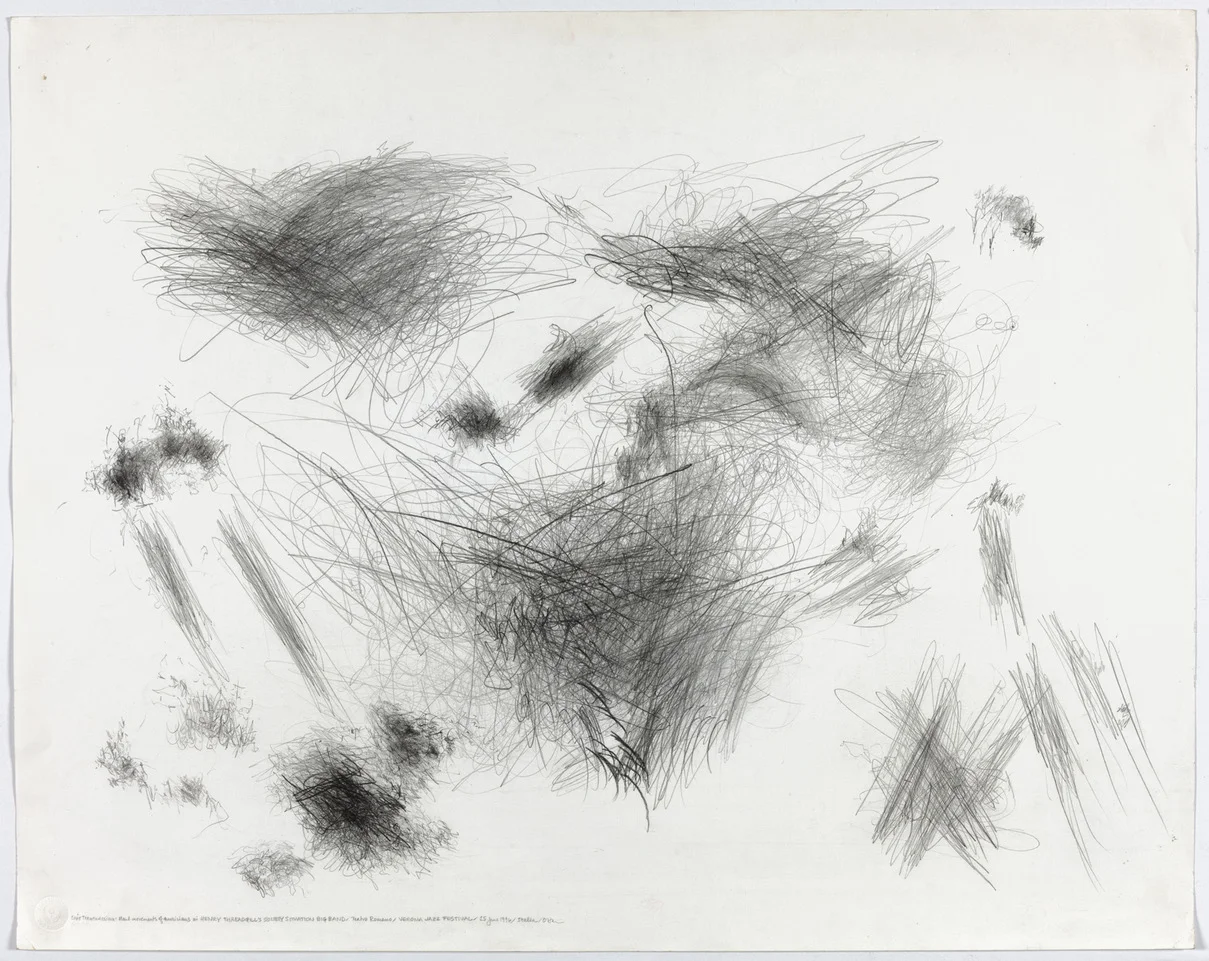 The seismograph-like drawings, performed in real time, capture the normally invisible, fleeting movement patters of music and dance performance. Condensed graphite line combines the controlled refinement of classical drawing with the unbound sensuality of spontaneous gesture.