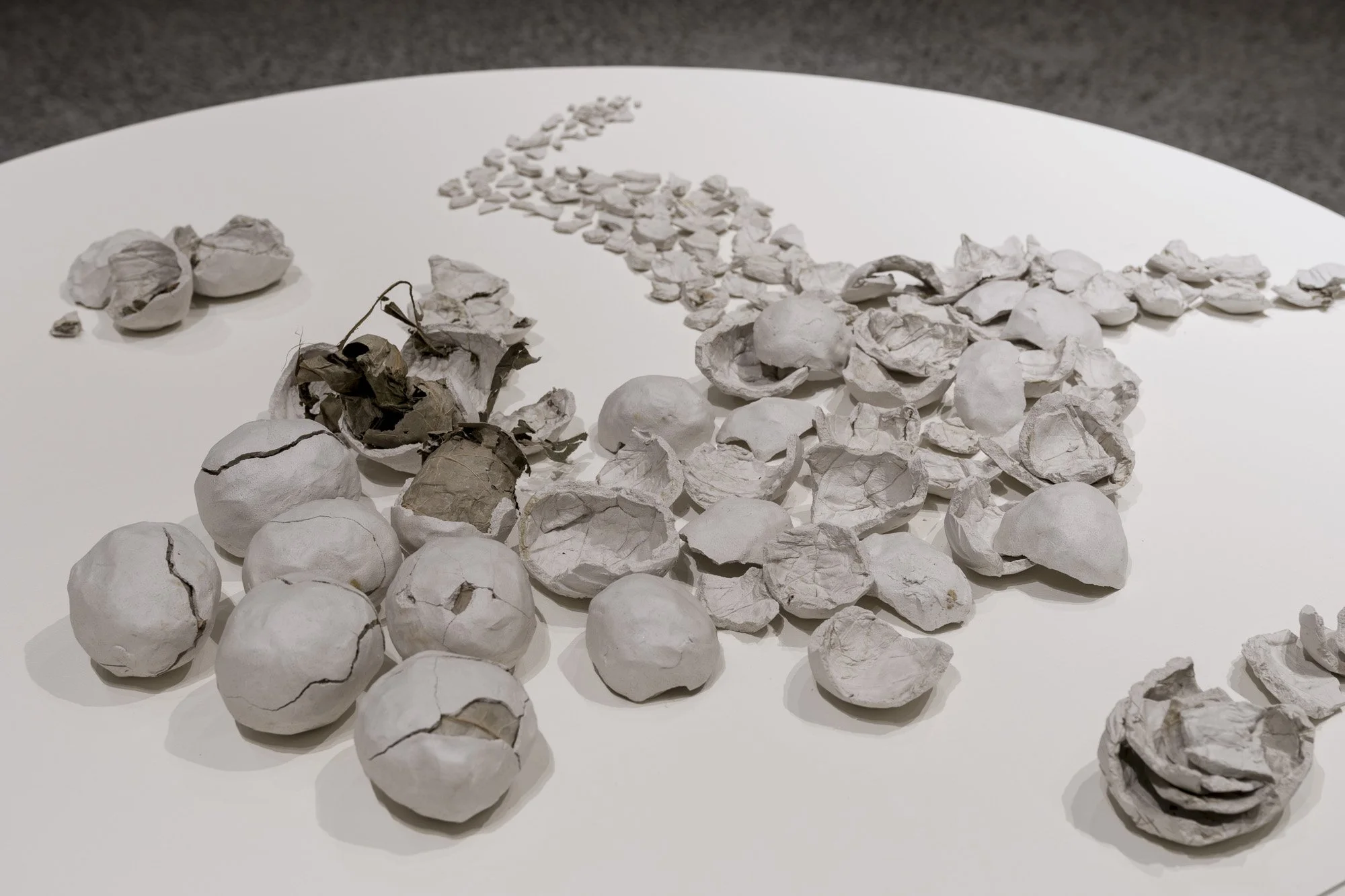 The sculptural work changes and grows over the course of the exhibition. The broken ceramic pieces accumulating on the table are performance remnants from the current series of ‘Silent Dinners.’ Participants are served clay baked food, which they break open to eat. The remnants of the bake are collected and accumulate after each performance.